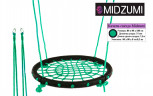 Качели-гнездо Midzumi выполнены из металлической рамы диаметром 80 сантиметров, с дополнительной защитной оплеткой ее бортиков, обтянутых прочным синтетическим канатом толщиной 10 мм выдерживающим нагрузку 100 кг. Плетеное синтетическое сидение качелей удобное и практичное, не собирает грязь и воду, при сильных загрязнениях его можно протереть.